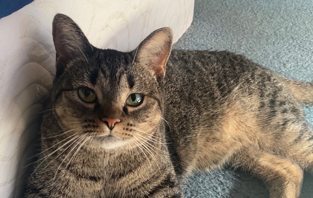 She scratches the chair, yawns, then affectionately rubs her body against my hands and legs, purring like a kitten.